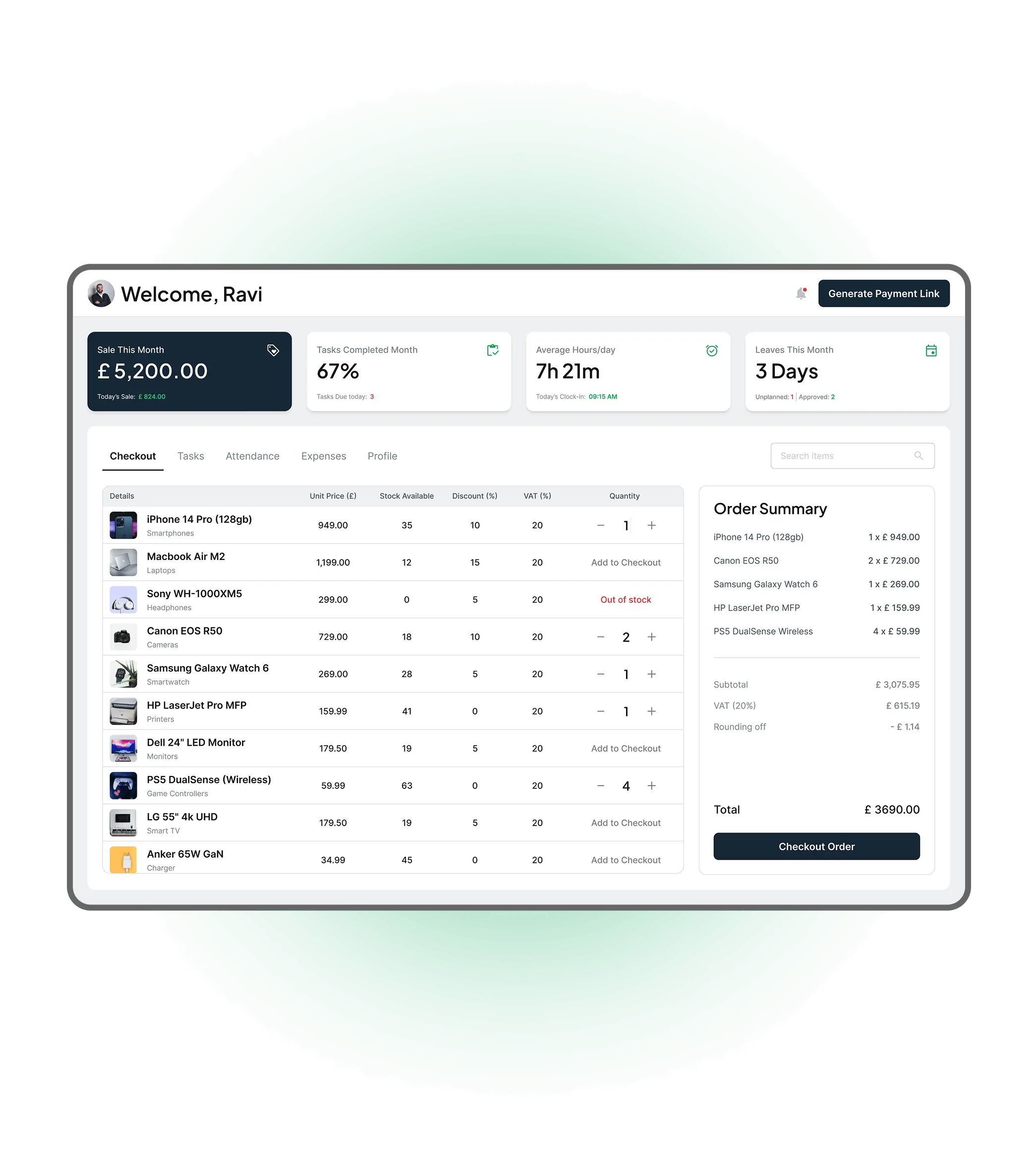 The Sales Rep Portal is designed to give reps everything they need in the field - without overloading them with admin tasks. Orders, payments, and customer records are centralised, ensuring sales activity always stays aligned with the main dashboard.